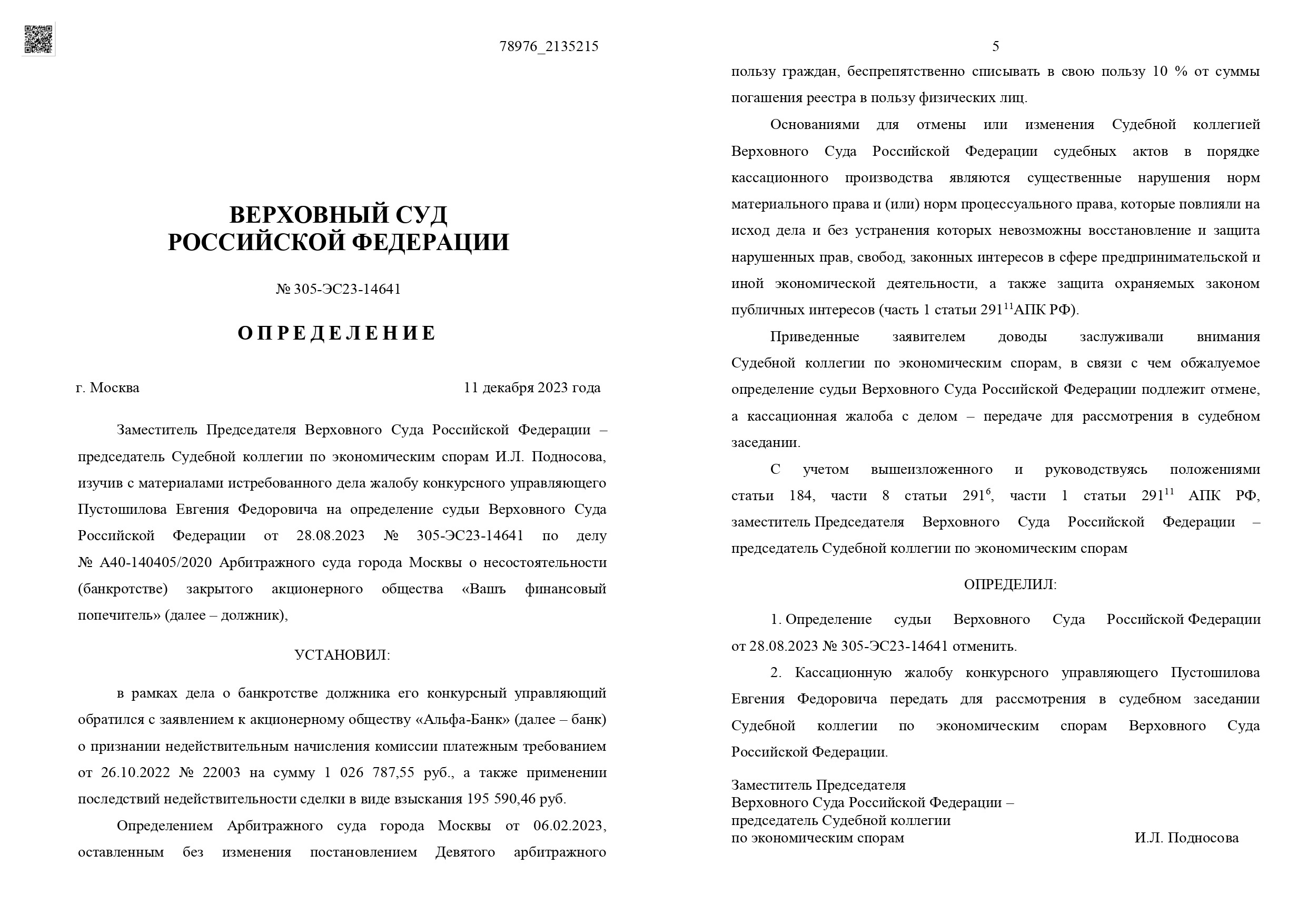 Определением Судебной коллегии Верховного Суда Российской Федерации по экономическим от 11 декабря 2023 г. определение судьи Верховного суда РФ от 28.08.2023 №305-ЭС23-14641 отменено, кассационная жалоба конкурсного управляющего Пустошилова Евгения Федоровича передана для рассмотрения в судебное заседание Судебной коллегии по экономическим спорам Верховного Суда РФ.